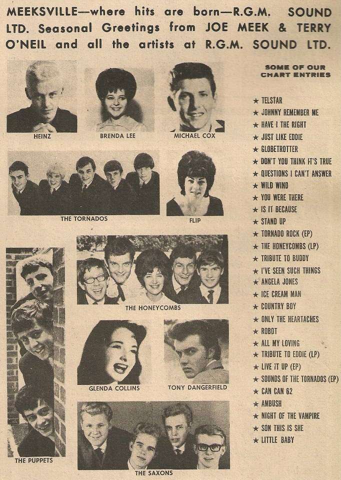 Joe Meek as our Manager, placed us with The George Cooper Organisation in London, just about the largest agency looking after most of the Pop and Rock Acts in the country. With the exception of Cliff Richard, whom I’ve never met, the Agency looked after people like Joe Brown, Cuddly Duddly, Dickie Pride, Vince Eager, Billy Fury, Lance Fortune, Marty Wilde, Danny Rivers, Jess Conrad, Michael Cox, Johnny Kidd and the Pirates, and lots and lots of others.