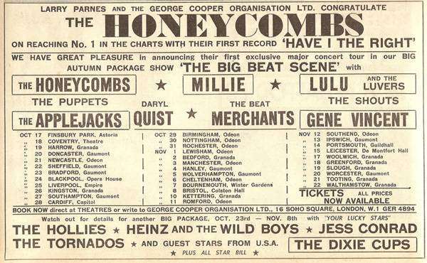 A few of the old ‘Concert’ programmes have survived. I have one of them, from ‘The Big Beat Scene’ tour of 1964, a nation wide ‘jaunt’ of the U.K. On that particular trip, with our band, The Puppets, were The Shouts, The Beat Merchants, Daryl Quist, Gene Vincent, The Applejacks, Lulu and the Luvvers, Millie, and The Honeycombs.