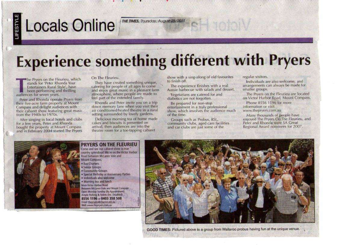 “The Pryers On The Fleurieu” – meaning Peter Rhonda Your Entertainers Rural Style.