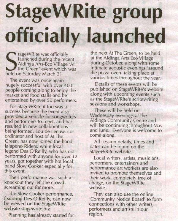 My partner, Mos Day, has started up StageWRite here in the Aldinga Bay area. The idea being to create a meeting place on-line for artists, performers, musicians, songwriters& technicians in the local area. StageWRite will also be bringing performance writing workshops to the region, as well as working with local theatre companies to develop scripts and stagecraft skills.With the StageWRite website as a place to meet others of similar interests, and a place to put yourself on line without charge, collaborations and communications between the local performance arts community will be made easy.